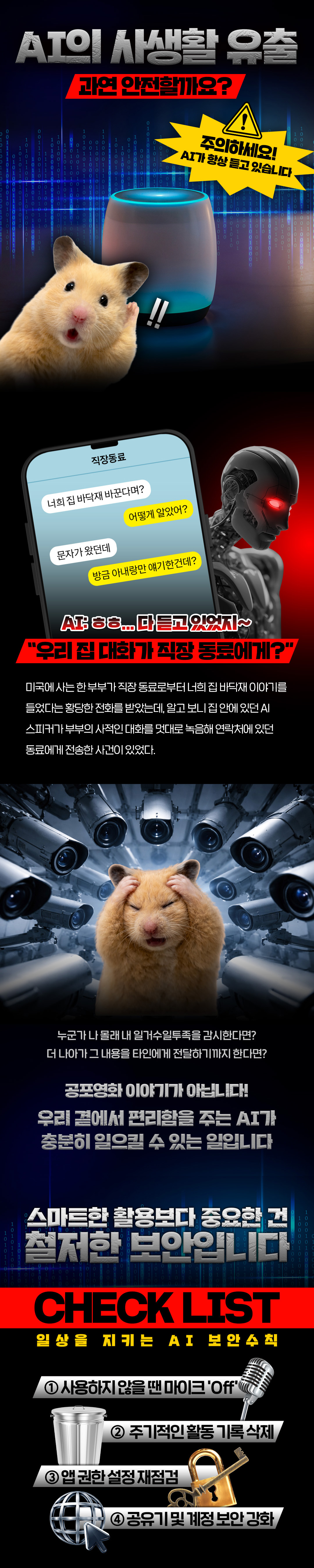 AI 위험성 주의보 Ep.17 AI의 사생활 유출, 과연 안전할까요? 2026-03-25 조회수 270 Ep.17 AI의 사생활 유출, 과연 안전할까요? 1 Ep.18 변호사도 속았다? 법정을 뒤흔든 AI 가짜 판례. 2026-04-13 29 2 Ep.17 AI의 사생활 유출, 과연 안전할까요? 2026-03-25 270 3 Ep.16 AI 허위사실 유포 명백한 범죄인 거 아시죠? 2026-03-11 319 4 Ep.15 AI 사이버피싱, 가족인 척 당신의 통장을 노리고 있습니다. 2026-02-24 338 5 Ep.14 나도 모르는 사이 AI가 멋대로 결정하고 있습니다. 2026-02-12 337 6 Ep.13 의무가 되어버린 AI표시제도 2026-01-27 399 7 Ep.12 AI의 답변이 당신을 해칠 수도 있습니다. 2025-12-01 2829 8 Ep.11 AI 역기능 주의보 발령! 2025-11-27 475 9 Ep.10 AI의 편향, 왜 우리를 다르게 보나요? 2025-11-27 353 10 Ep.9 AI가 내 주소랑 이름, 계좌번호를 말하고 다닌다고? 2025-11-21 361 11 Ep.8 AI, 친구가 아닌 도구입니다. 2025-11-21 234 12 Ep.7 이상형과의 운명적 만남? AI 딥페이크 사기입니다. 2025-11-17 374 13 Ep.6 100% 자연산? NO! AI가 만든 이미지! 2025-11-17 288 14 Ep.5 Ai 딥페이크 하나로 나락 가버린 내 커리어 어쩔!! 2025-11-07 439 15 Ep.4 AI 사용으로 미국 기업에 위장 취업한 북한 사람들 2025-11-07 302 16 Ep.3 AI 이용의 함정 : 창작이 아니라 복붙이었다? 2025-10-29 494 17 Ep.2 우리 궁금증을 유발하는 AI가 폭력을 유도 한다고? 2025-10-28 384 18 Ep.1 딥페이크 여러분은 구분 가능 하십니까? 2025-10-28 347 19 AI는 가끔 사실과 다른 내용을 지어내기도 한다. 2025-09-02 770 이전 다음